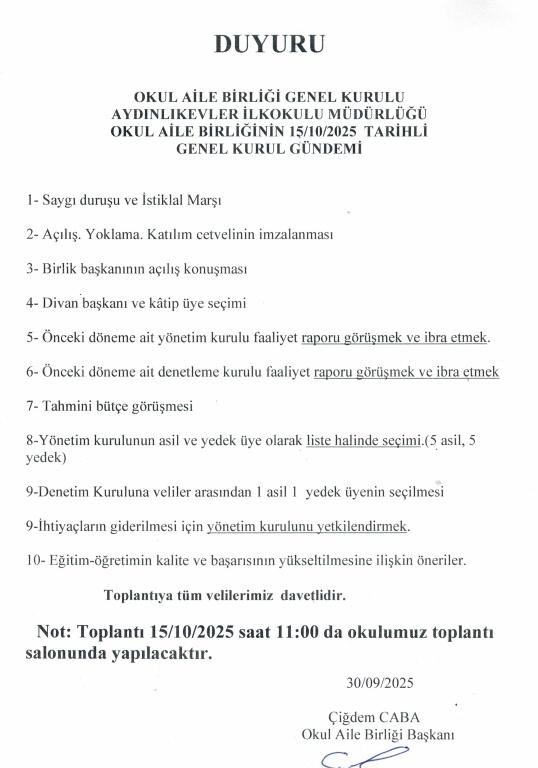 2025 2026 EĞİTİM ÖĞRETİM YILI OKUL AİLE BİRLİĞİ GENEL KURUL TOPLANTISI 15/10/2025 TARİHİNDE SAAT 11.00 DE TOPLANTI SALONUNDA YAPILACAKTIR.